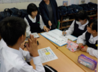 3年生が静かに朝学習に励む中、1・2年生が校内の美化活動を行っています。